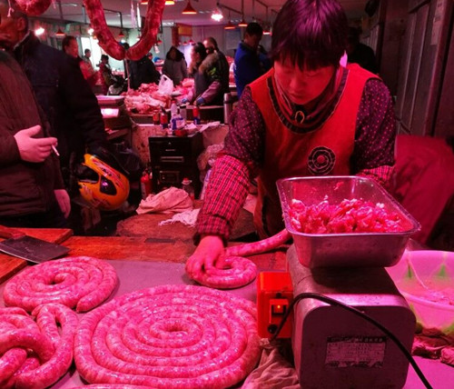 “現在每天都有人來訂購香腸,有的人是買肉回去自己灌,有的人直接就在這里訂做,為了保證前來訂做的客戶都能按時拿到香腸,我們不得不加大工作量,每天從凌晨5點忙到晚上7點鐘才收工?!?5號攤位薛老板一邊忙活一邊告訴我們。