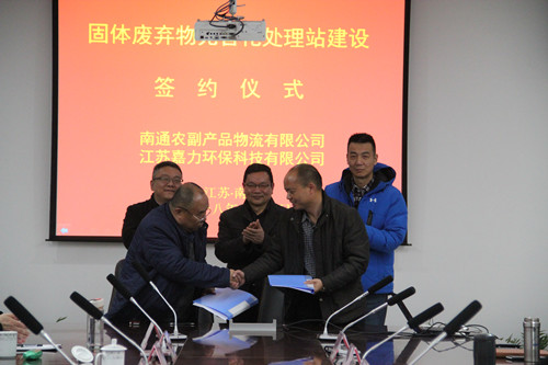 隨著通農物流經營交易規模與范圍的逐步擴大,市場內各類垃圾產生量也逐漸增多,為進一步優化市場環境,通農物流在2017年年底就將垃圾處理站建設納入計劃,今年3月6日,在通農物流展銷樓5樓會議室,南通農副產品物流有限公司副總經理闞君成與江蘇嘉力環保有限公司總經理楊迅代表合作雙方正式簽署了“固體廢棄物無害化處理站建設”的合作協議。崇川區區委常委張祖春、南京工業大學教授趙龍章和通農物流總經理曹俊等相關領導見證了此次簽約儀式。