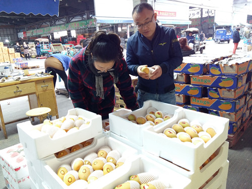 4月南方時令水果大量上市,口感最佳,價格下降得也快,從臺灣、海南、云南等地直銷過來的水仙芒、菠蘿、東方蜜等,與上周相比,價格呈現明顯回落態勢,均價低出二到三成。芒果作為應季水果的主要代表,銷售勢頭迅猛,本周銷量較上周增長40%,尤其是臺灣水仙芒在眾多品種的芒果中銷量最大,日銷量20噸以上,均價8.5元/500克。云南的桑葚個大、多汁、味甜,深受中老年市民的青睞,在品嘗的同時勾起人們兒時的回憶。浙江的東方蜜果肉松脆、細膩,批發價4-4.5元/500克;遼寧的櫻桃是目前水果中的新貴,因量少而價高,目前在30-40元/500克,隨著天氣轉暖,口感會更好,價格將走低。