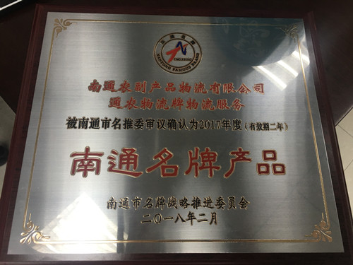 2018年2月,經南通市名牌戰略推進委員會審議確認南通農副產品物流有限公司通農物流牌物流服務為“2017年度(有效期二年)南通名牌產品”。