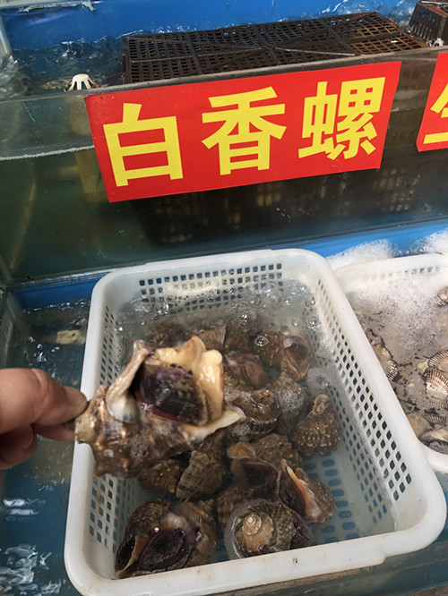 在購買螺螄的時候要選擇外殼呈青色,且有一定光潔度的螺螄。太大的螺螄肉質粗糙,太小的又食之不甘。一般選個頭不大不小,殼的顏色是褐色里透著黃綠色的螺螄。與此同時,除了帶殼的螺螄外經營戶還準備了大量的螺螄肉,節約了消費者的時間。現在的螺螄價格也是非常優惠,每斤2.5—3元。白香螺在33—35元/斤,相思螺分大小,大的35元左右/斤,一只大約半斤重,小的相思螺30元/斤。花螺70元左右/斤,海螺28—30元/斤。(水產區 陳珊珊)