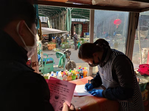 (二)全面登記。所有經(jīng)營(yíng)戶(hù)進(jìn)場(chǎng)必須測(cè)量體溫,做好人員、車(chē)輛、貨源的登記工作,所有職工上下班必須測(cè)量體溫。交易區(qū)每個(gè)大棚要有專(zhuān)人負(fù)責(zé),每日都要調(diào)查了解,一旦發(fā)現(xiàn)經(jīng)營(yíng)戶(hù)體溫有異常的,必須立即向安保部匯報(bào)。同時(shí),消毒工作要做到全覆蓋。