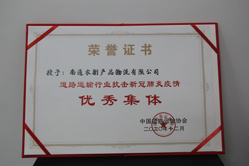 2020年12月14日至16日,中國道路運輸協(xié)會在京召開第六屆二次理事大會,對2020年中國道路運輸抗疫保通、復工復產(chǎn)先進集體和個人進行通報表揚。南通農(nóng)副產(chǎn)品物流有限公司被授予“道路運輸行業(yè)抗擊新冠肺炎疫情優(yōu)秀集體”榮譽稱號。黨總支書記、總經(jīng)理徐徑被評為“道路運輸行業(yè)抗擊新冠肺炎疫情優(yōu)秀個人”。