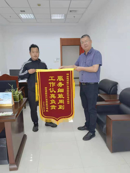 12日上午,冷鏈部辦公室內傳來陣陣爽朗的笑聲,商戶詹秋明先生和冷鏈部經理袁東雙手緊緊握在一起,詹秋明先生對冷鏈部干部職工認真負責的工作態度,熱情周到的服務給予了肯定并表示了感謝,隨后雙手奉上一面寫著“工作認真負責,服務細致周到”的錦旗,表示今后會一如既往地配合冷鏈部的工作,實現雙贏。