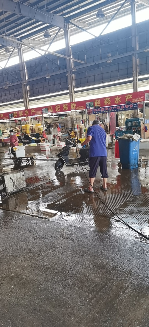 6月15日,水產肉類交易區主管范淵帶領當班人員、保潔人員對交易場地地面進行了全面沖洗,同時對亂堆放進行了集中整治,還大家一個干凈、整潔的交易環境。(水產區 陳旭鵬)