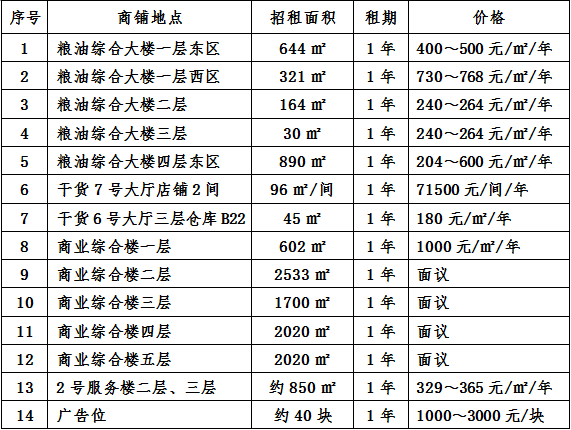 1.招租業態:干貨、糧油、倉儲、配送、美容理發、超市、酒水、藥房、通訊營業廳、銀行及餐飲等市場配套服務類經營項目;對應標的物所能從事的經營業態,最終解釋權歸干貨配送部;