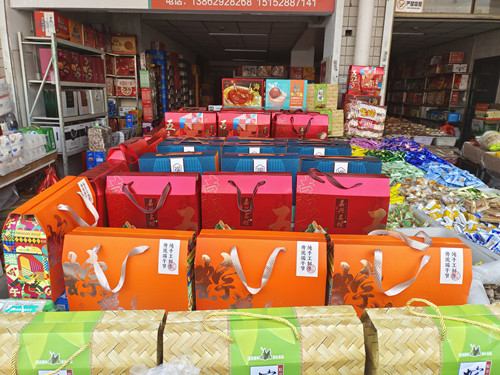 端午節臨近,在干貨大廳的店鋪里粽子已悄然上市,有禮盒裝的、袋裝的,粽子禮盒琳瑯滿目。走進店鋪內,店鋪老板在為顧客挑選、打包。店鋪老板推出了不同品牌、不同口味的粽子,袋裝粽子普遍售價在10元以下,禮盒裝粽子價格在50元到80元不等,口味以傳統的白米、鮮肉、蜜棗、蛋黃、豆沙為主。